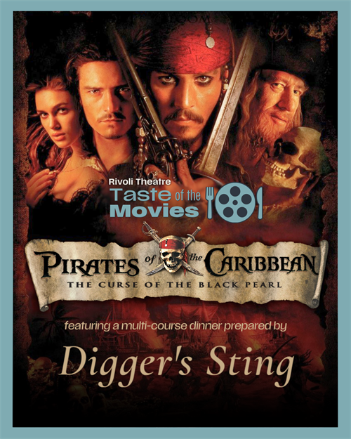 Drink up me ‘earties, yo ho! Step aboard the Black Pearl if ye dare to join us on Sunday, June 7th for a Taste of the Movies with Disney’s Pirates of the Caribbean: The Curse of the Black Pearl! This will be very different from Rivoli’s usual concessions! We are partnering with our talented friends at Digger’s Sting to bring you an immersive experience featuring a themed multi-course prix-fixe dinner prepared by Diggers with cocktails prepared by Rivoli served in the historic Main Theater.